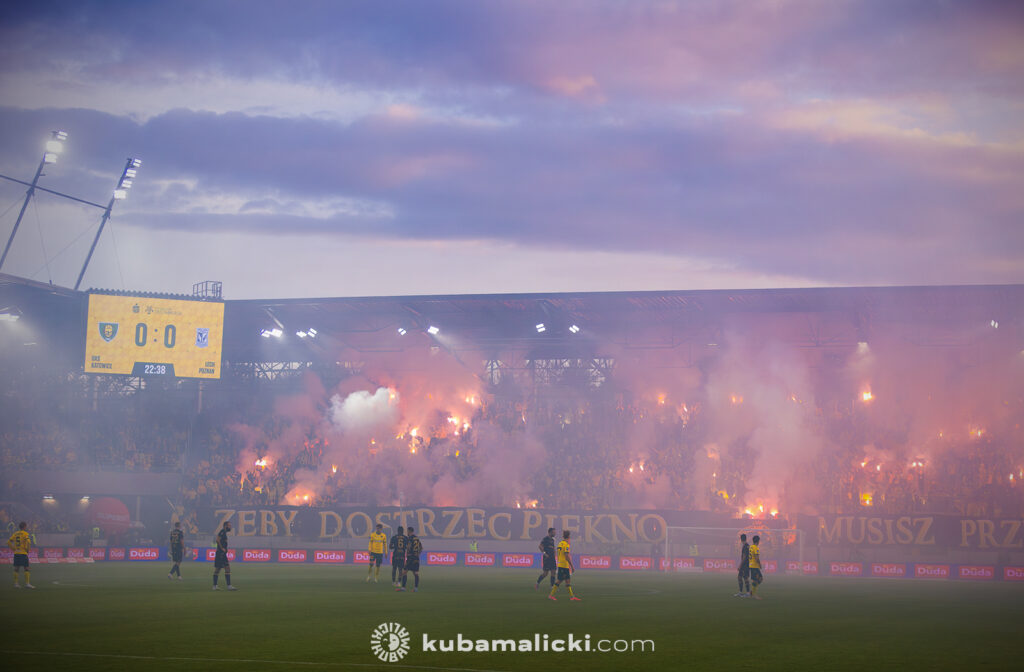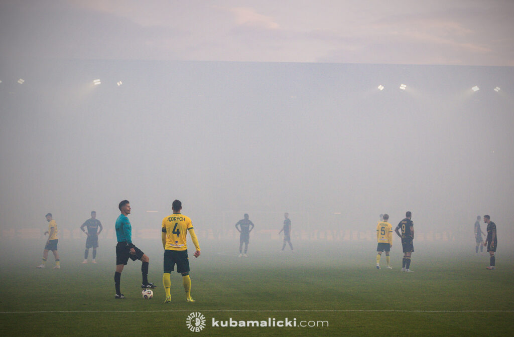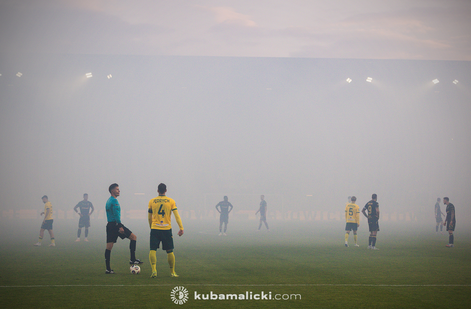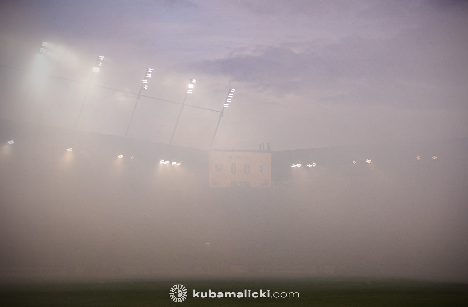 Jednak mecz w Katowicach od początku wyglądał inaczej. Bardziej przypominał piłkarskie szachy niż otwarty pojedynek. Gospodarze próbowali rozgrywać atak pozycyjny, lecz nie stworzyli żadnych groźnych sytuacji pod bramką Bartosza Mrozka. Z kolei nieliczne akcje Lecha kończyły się niecelnymi strzałami z okolic linii pola karnego. Dopiero po 13-minutowej przerwie spowodowanej odpaleniem pirotechniki przez śląskich ultrasów, „Kolejorz” stworzył dogodną sytuację bramkową, sfinalizowaną celnym strzałem Bryana Fiabemy.