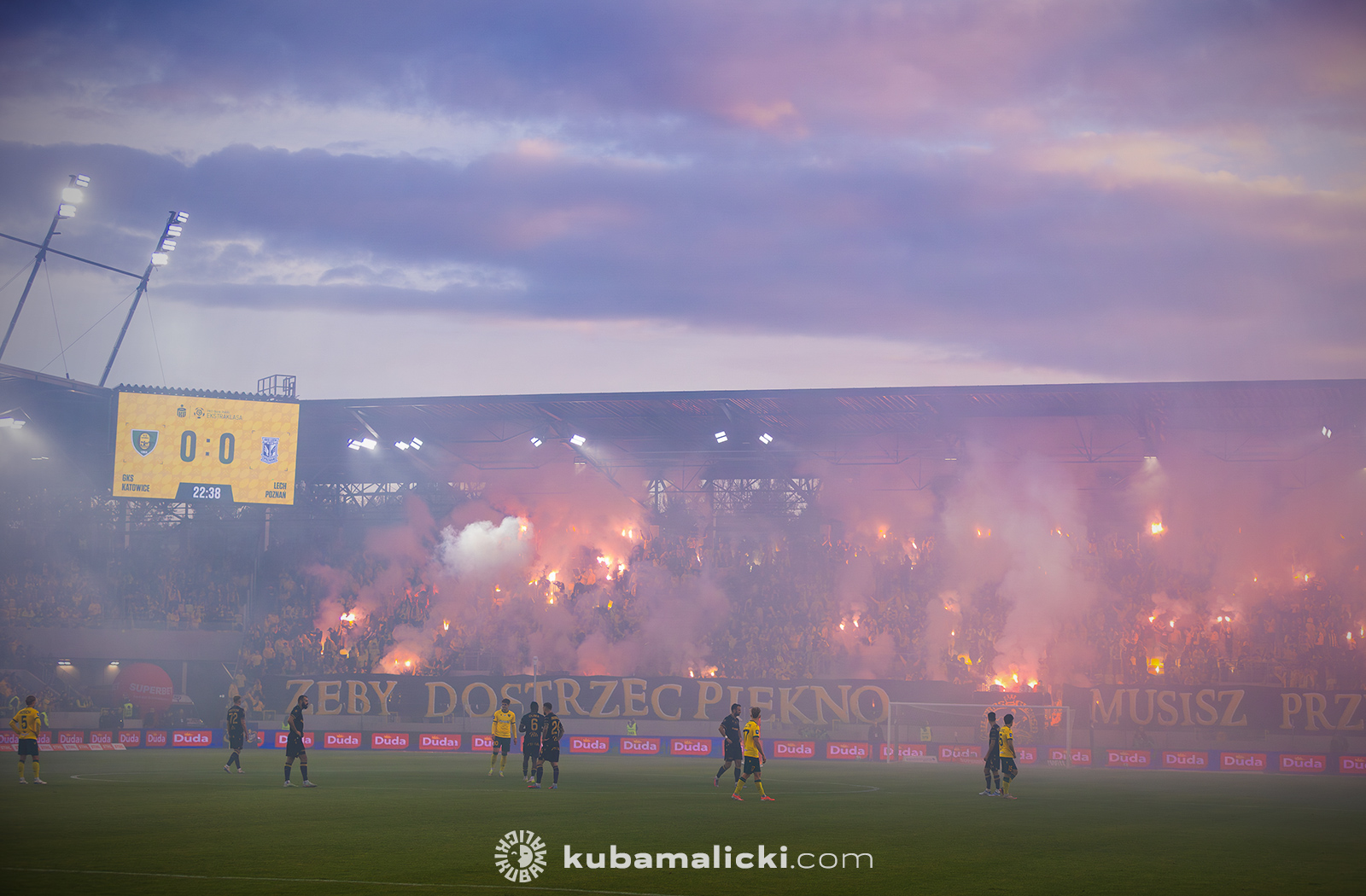 W niedzielne popołudnie piłkarze Lecha wybiegli na murawę stadionu w Katowicach opromienieni efektownym zwycięstwem nad Rapidem Wiedeń. Mimo kilku zmian w wyjściowej jedenastce, liczni kibice w sektorze gości liczyli na kolejny ofensywny mecz ekipy „Kolejorza”. Wszak w ostatnich 4 bataliach Mistrz Polski strzelał przynajmniej 2 bramki – wygrywając 2-0 w Niecieczy, remisując po 2-2 z Rakowem i Jagiellonią oraz wspomniane 4-1 z austriackim rywalem na inaugurację Ligi Konferencji.