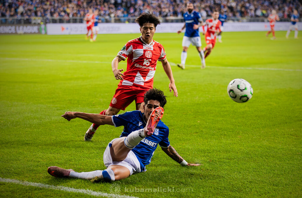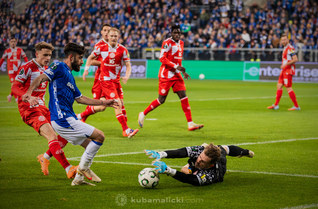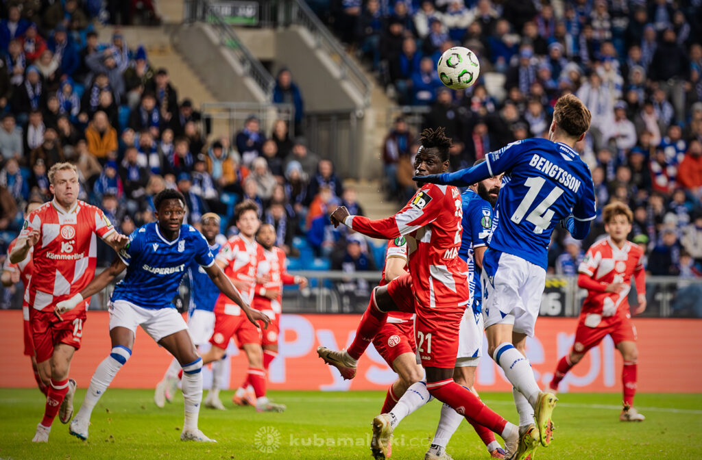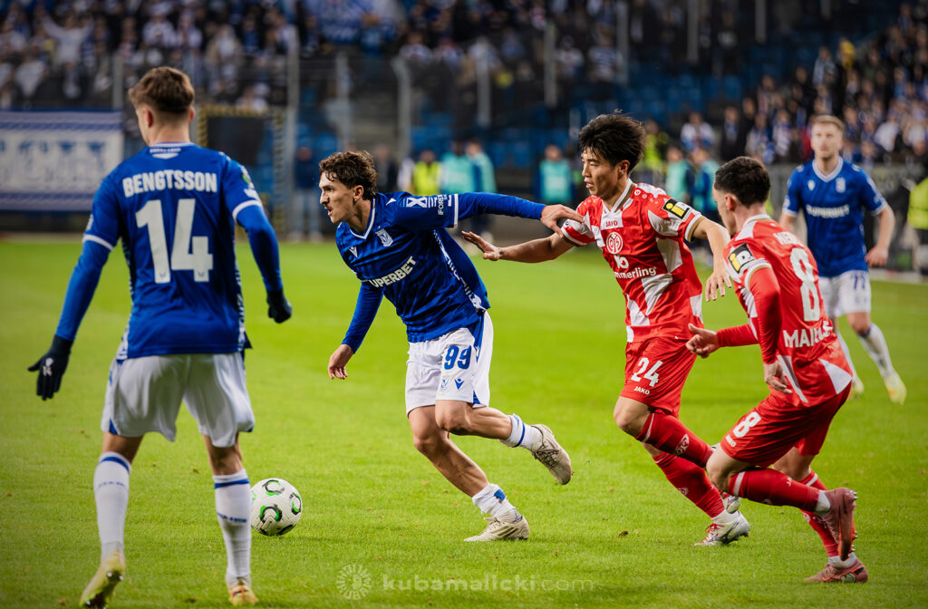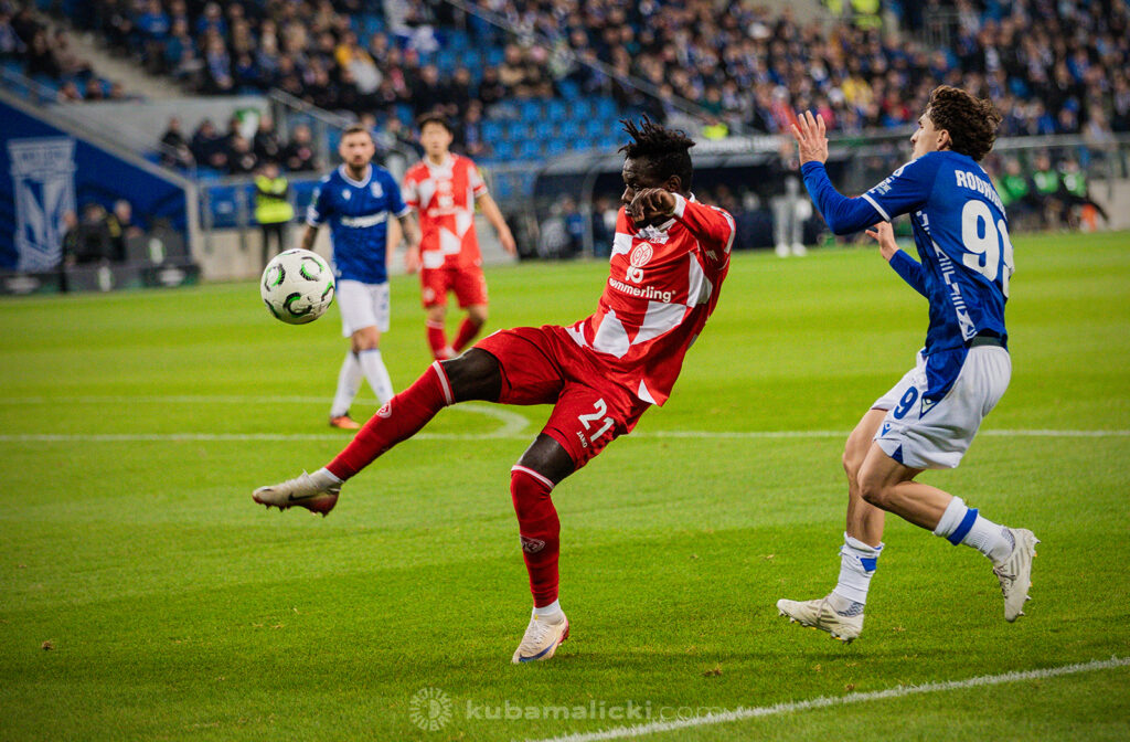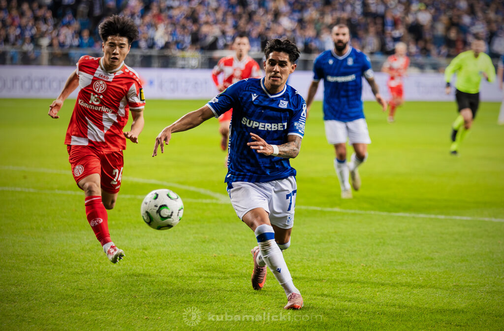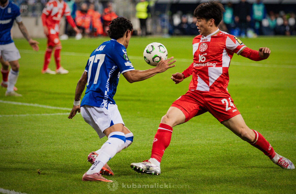 Czwartkowy mecz długo nie układał się po myśli poznaniaków. Od początku Mainz miało przewagę i konstruowało groźne akcje pod bramką Bartosza Mrożka. W 28. minucie Japończyk Sōta Kawasaki strzelił pierwszego gola. 4 minuty później goście strzelili drugiego gola, którego jednak sędzia nie uznał, orzekając spalony po wideoweryfikacji. Wynik meczu ustalił kapitan Michael Ishak, który wykorzystał rzut karny po faulu Kawasakiego na Luisie Palmie.