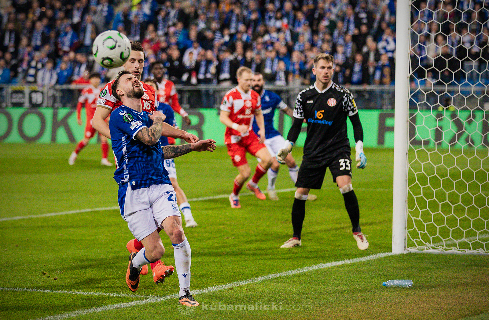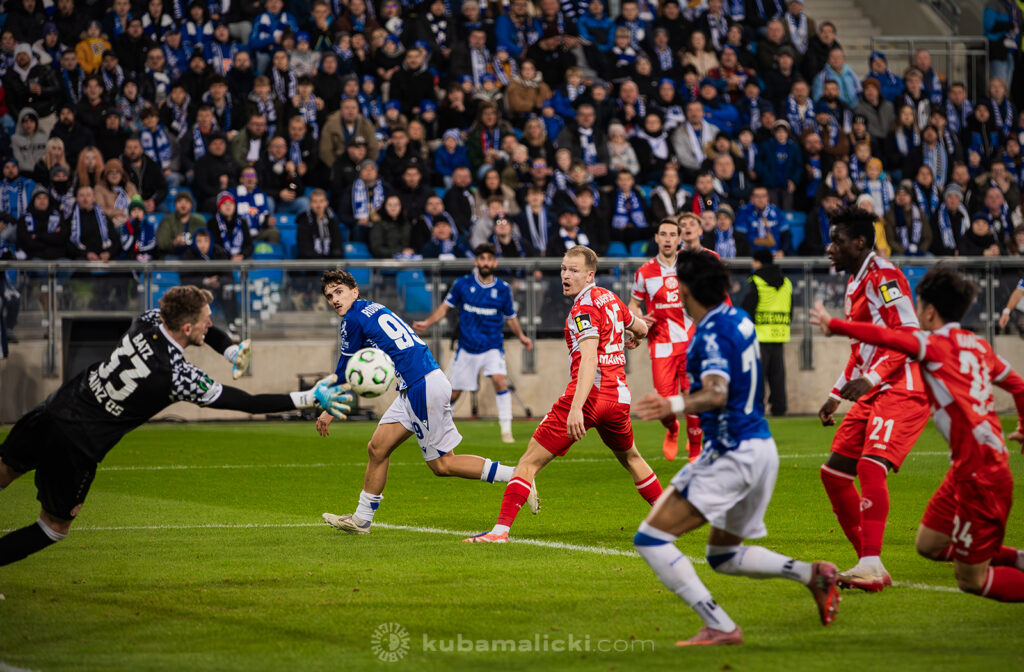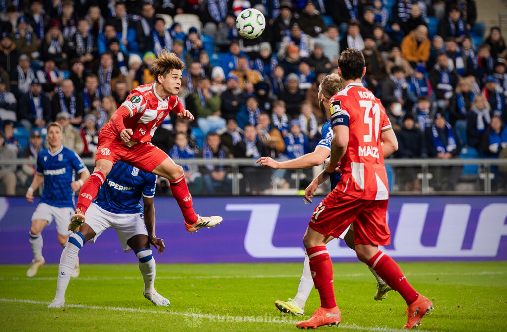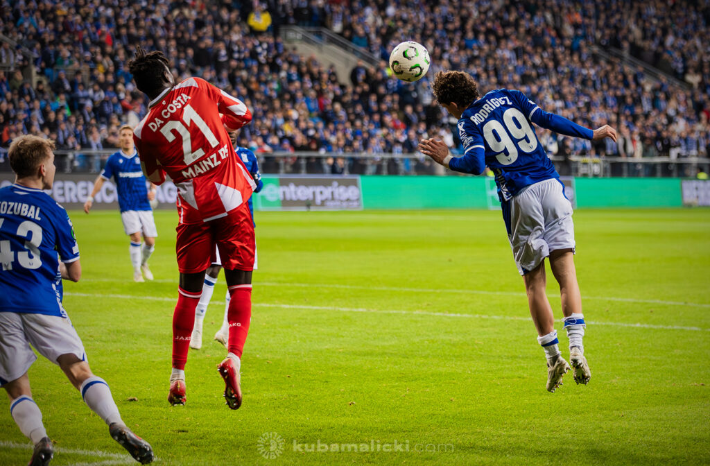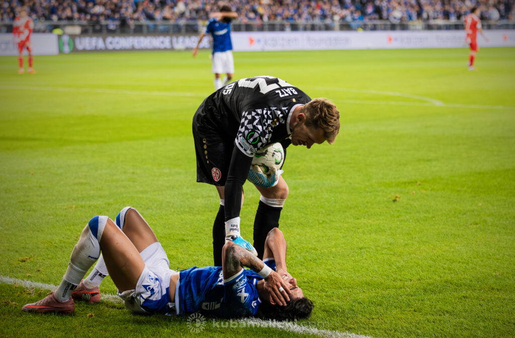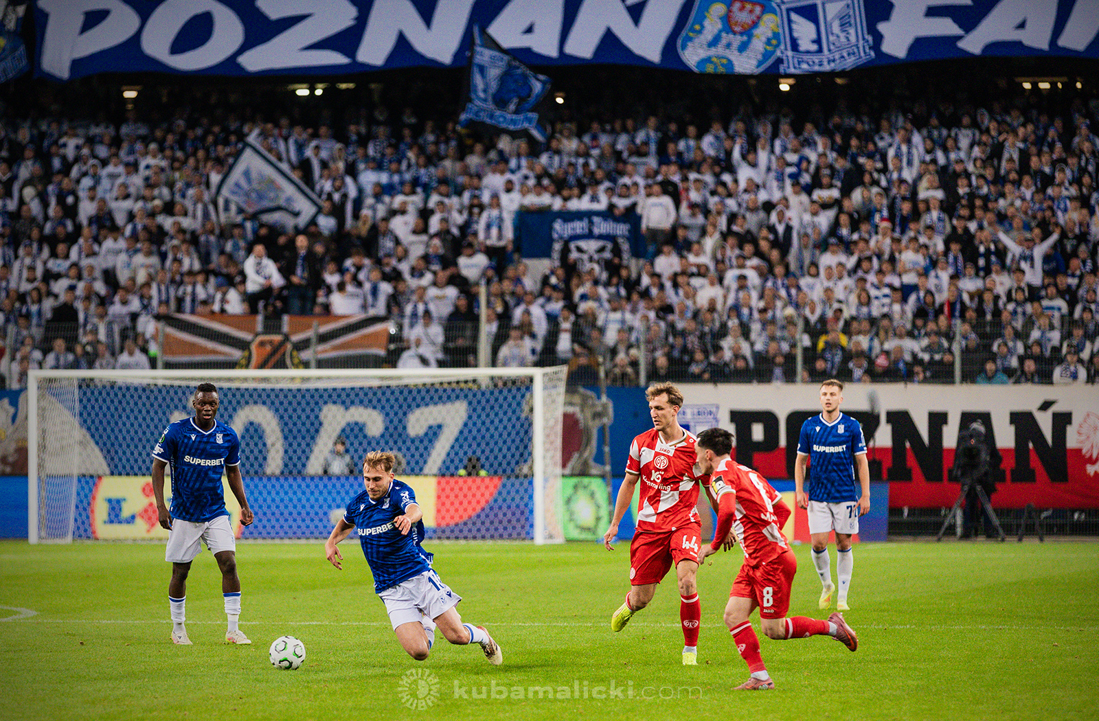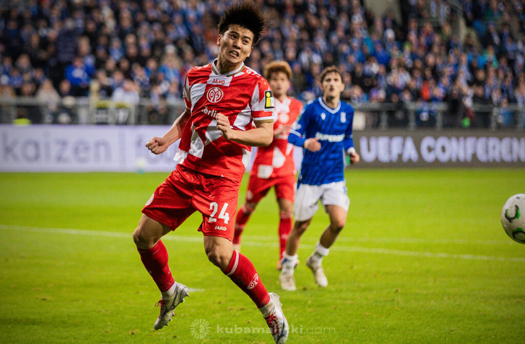 Czwartkowy mecz długo nie układał się po myśli poznaniaków. Od początku Mainz miało przewagę i konstruowało groźne akcje pod bramką Bartosza Mrożka. W 28. minucie Japończyk Sōta Kawasaki strzelił pierwszego gola. 4 minuty później goście strzelili drugiego gola, którego jednak sędzia nie uznał, orzekając spalony po wideoweryfikacji. Wynik meczu ustalił kapitan Michael Ishak, który wykorzystał rzut karny po faulu Kawasakiego na Luisie Palmie.