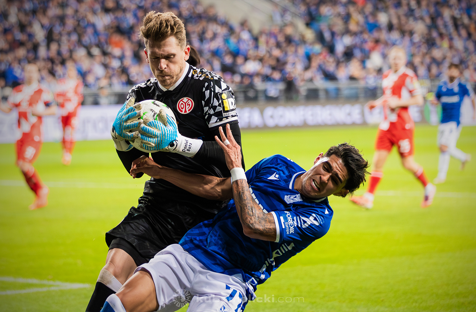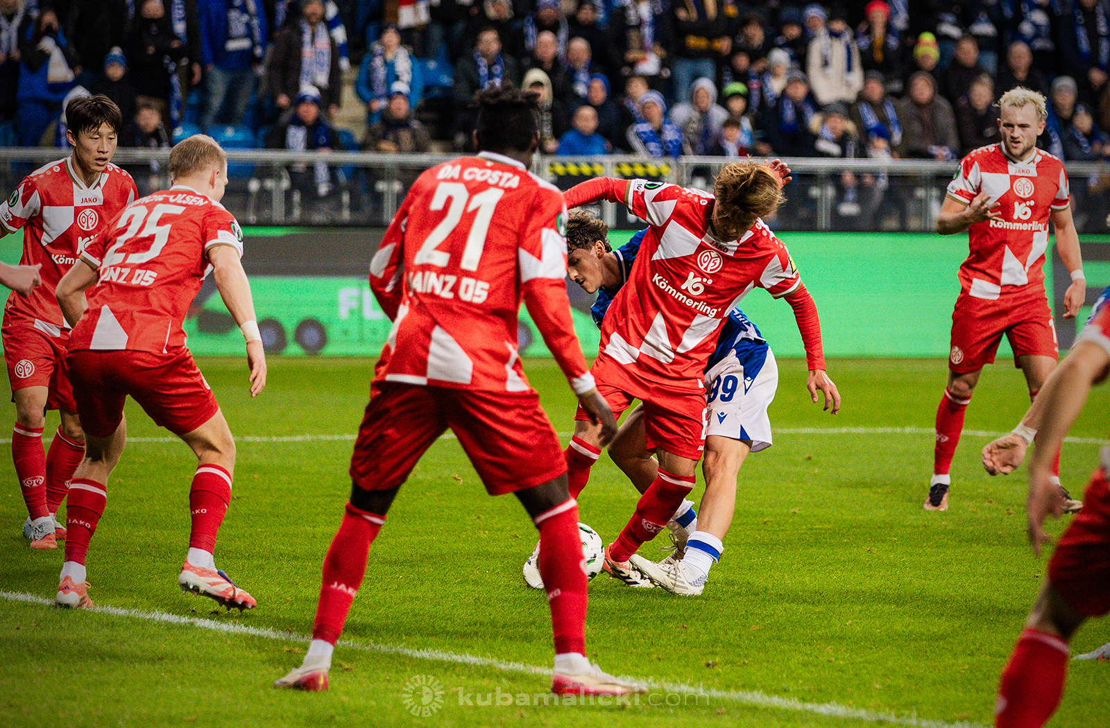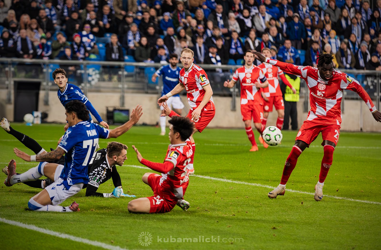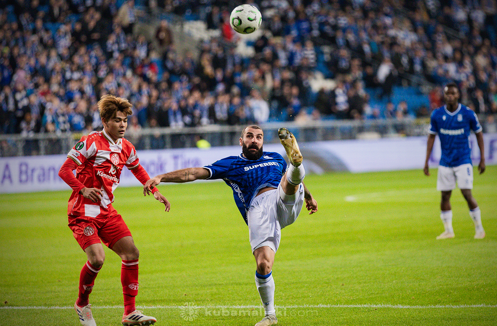 Czwartkowy mecz długo nie układał się po myśli poznaniaków. Od początku Mainz miało przewagę i konstruowało groźne akcje pod bramką Bartosza Mrożka. W 28. minucie Japończyk Sōta Kawasaki strzelił pierwszego gola. 4 minuty później goście strzelili drugiego gola, którego jednak sędzia nie uznał, orzekając spalony po wideoweryfikacji. Wynik meczu ustalił kapitan Michael Ishak, który wykorzystał rzut karny po faulu Kawasakiego na Luisie Palmie.