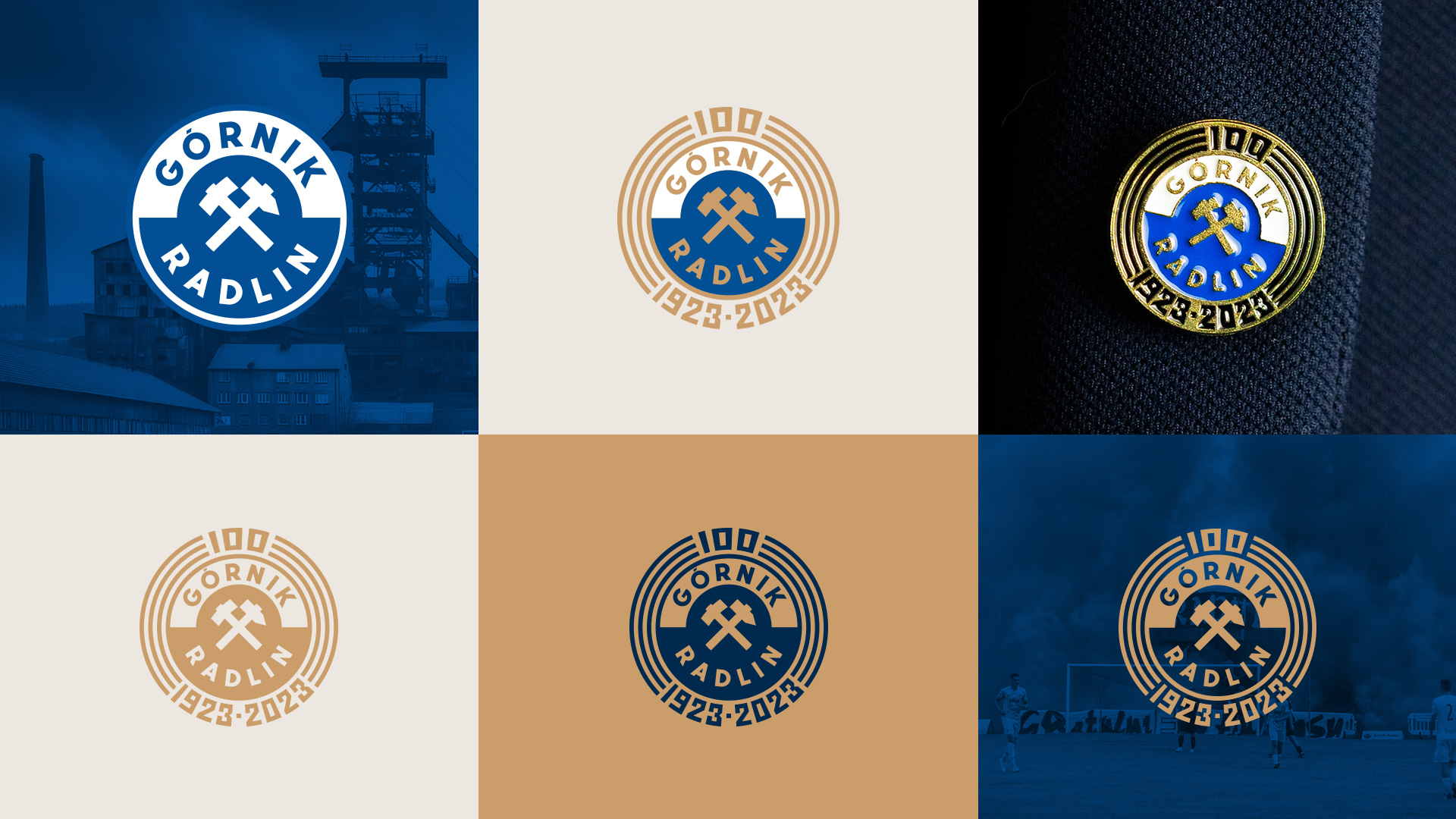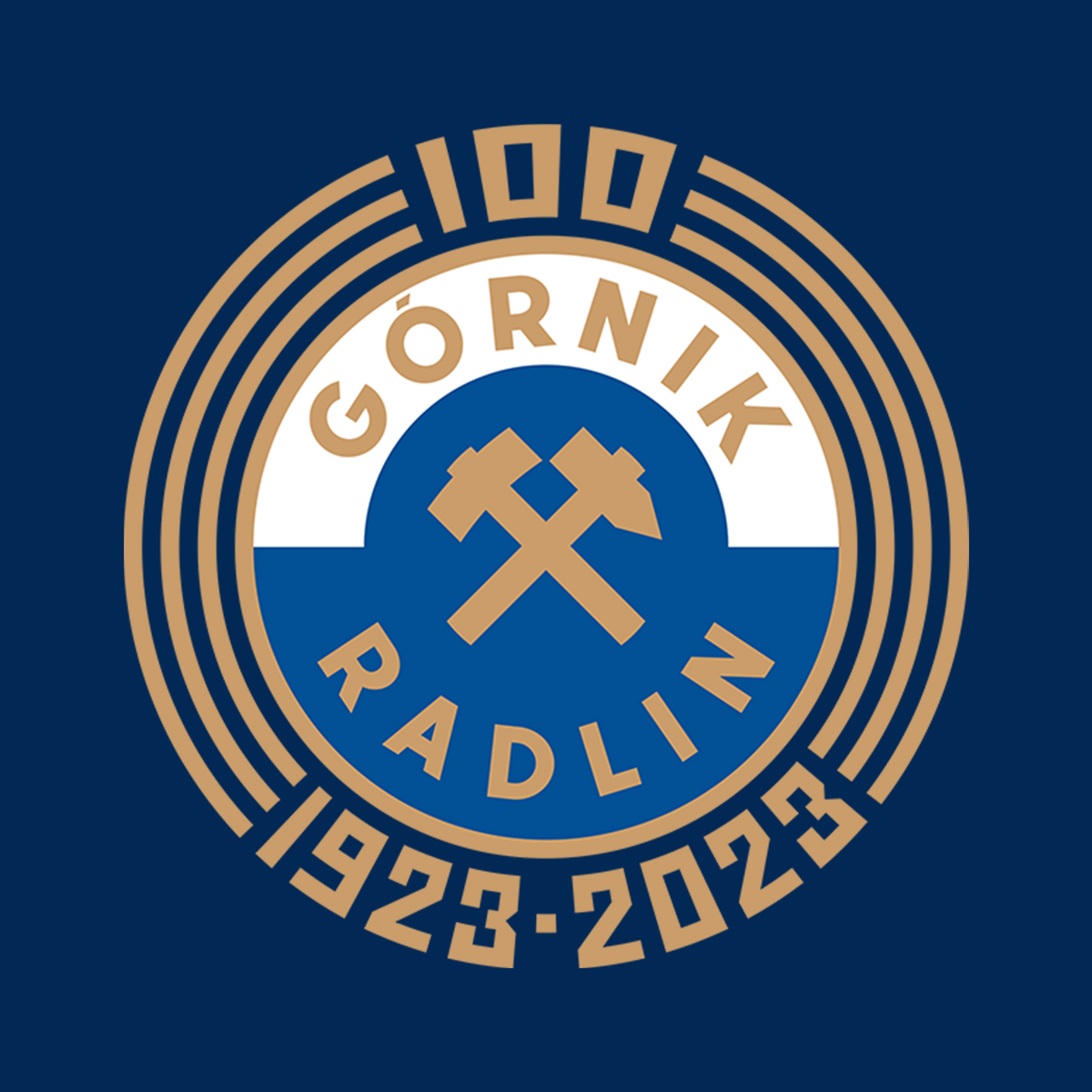 Górnik Radlin może pochwalić się wicemistrzostwem Polski w 1951 roku, 8 sezonami w ekstraklasie oraz… długowiecznym emblematem, w którym złote młotki górnicze symbolizują historyczną tożsamość klubu. W projekcie znaku postawiłem na proste rozwiązanie – linearny wieniec z wkomponowanymi liczbami. Przy okazji odświeżyłem herb klubu, upodabniając go do historycznego pierwowzoru.