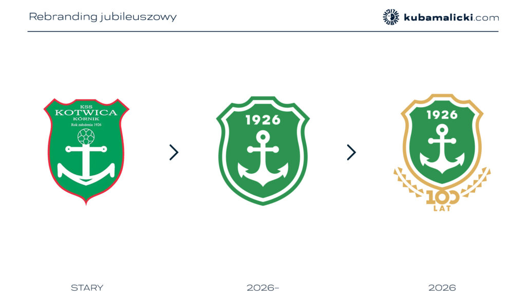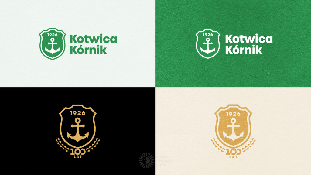 Wielkopolski Kórnik jest znany z neogotyckiego zamku, położonego nieopodal jeziora. Na drugim brzegu znajduje się stadion Kotwicy, która wchodzi w rok 100-lecia z odświeżonym herbem. Znak klubu został uproszczony, gdyż jego symbol, barwy i rok założenia tworzą wystarczająco charakterystyczną kompozycję. Elementy jubileuszowe nawiązują do blanków zamku.