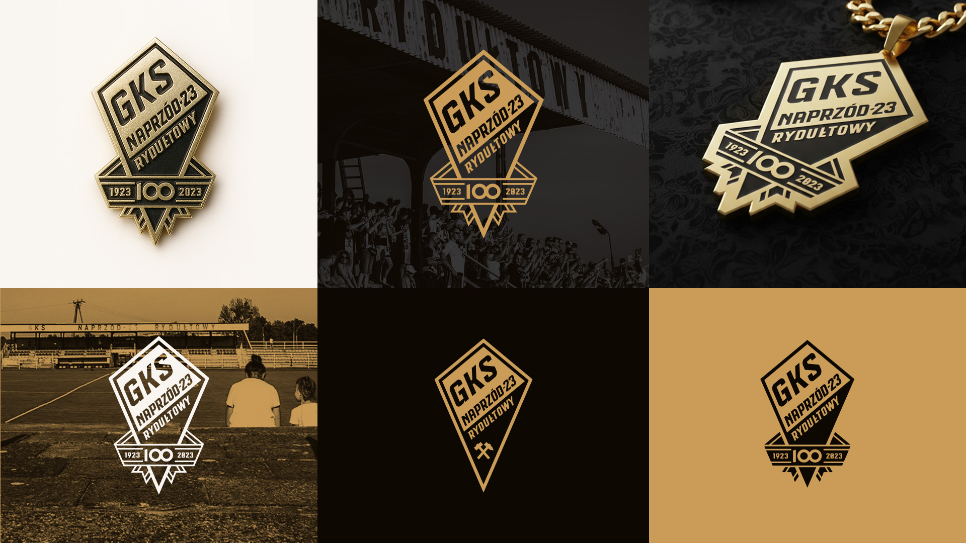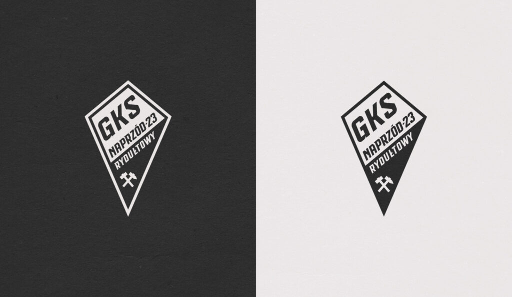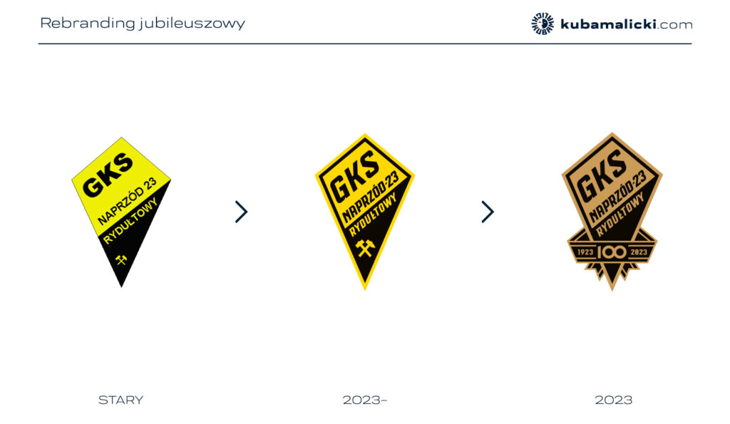 Naprzód-23 Rydułtowy rozegrał osiem sezonów na zapleczu ekstraklasy w latach 90., dzięki czemu zapisał się w kronikach futbolowych. Charakterystyczny żółto-czarny emblemat rydułtowian zapadł w pamięci pokolenia kibiców, a jego późniejsze próby unowocześnienia nie przyniosły dobrych rezultatów. W ostatnich latach klub występował już tylko w niższych ligach, ale przy okazji jubileuszu 100-lecia działacze chcieli przywrócić blask lokalnej marce sportowej. Zamówili okolicznościowy znak, a ja zaproponowałem również uporządkowanie formy graficznej herbu z tarczą w kształcie deltoidu. Lifting obejmował poprawę jego proporcji oraz liternictwa. Okolicznościowy znak zawiera również ozdobną szarfę i złoto-czarną kolorystykę.