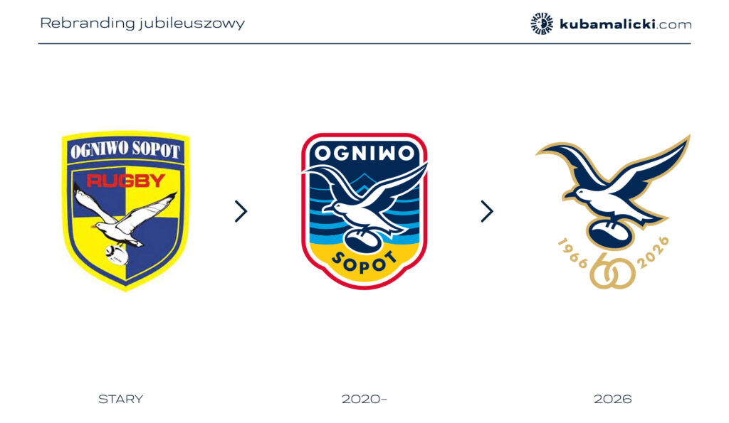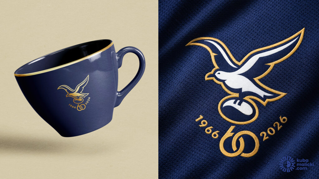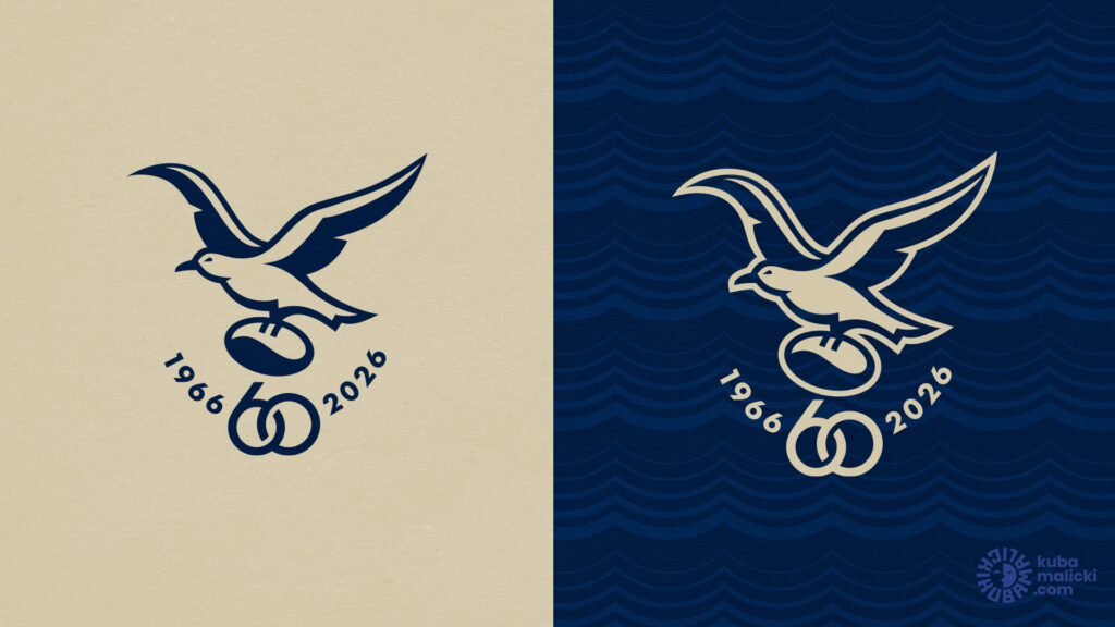 Ogniwo Sopot to ikoniczny klub w polskim rugby. 11-krotny Mistrz Polski, od dziesięciu lat kończą sezon na podium rozgrywek Ekstraligi. Nasze drogi przecięły się 6 lat temu, gdy zaprojektowałem nowy herb klubu. Projekt okazał się przełomowy w wielu aspektach. Dla Ogniwa stanowił znaczący krok w rozwoju marki, u mnie zainicjował kilka większych projektów sportowych. U progu 2026 roku zamówili logo z okazji 60-lecia. Postawiłem na otwartą formę logotypu z wyeksponowanym symbolem klubu – mewy trzymającej piłkę do rugby. Cyfry w „60” połączyłem niczym dwa ogniwa. Kolorystyka została uproszczona do złotego i granatowego z białymi akcentami.