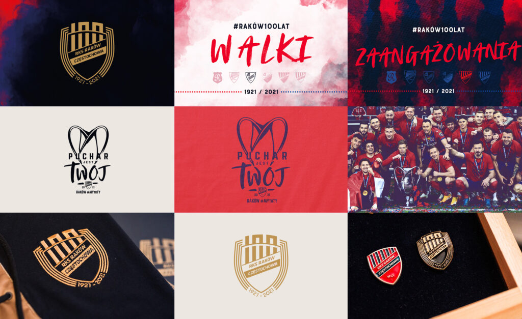 W 2021 roku Raków Częstochowa świętował 100-lecie założenia. Z tej okazji klub zamówił okolicznościowy znak graficzny – oparty na aktualnym herbie, który zmodyfikowałem dopasowując element literniczy nad tarczą. Symbol „100” w projekcie wyłania się ponad obrys herbu niczym kominy w historycznym emblemacie klubu, wspieranego przed laty przez Hutę Częstochowa.