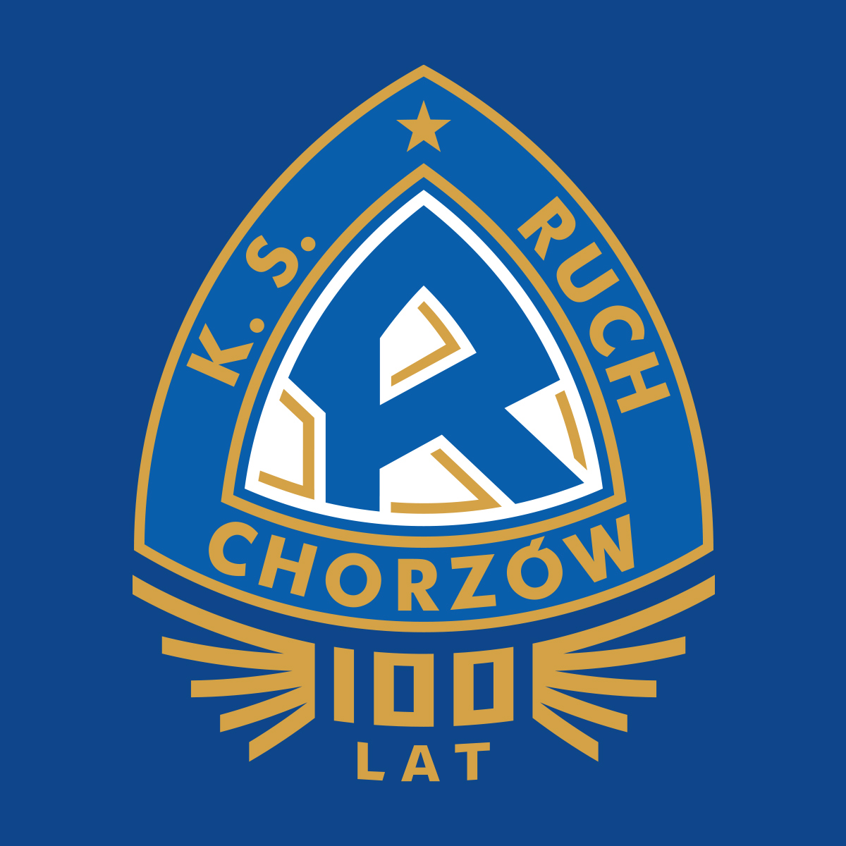 Ruch Chorzów może pochwalić się długowieczną tradycją i wielce oryginalnym herbem z tarczą w kształcie Trójkąta Realeux, przyjętym w latach 20. XX wieku. Okolicznościowa „100-tka” została dopasowana do łuku tarczy i otoczona ozdobnym kształtem, przypominającym wieniec lub skrzydła Górnośląskiego Orła (i maskotki klubu, tzw. Adlera). Sama kompozycja znana była również w historii Ruchu – podobny układ miała odznaka 40- i 50-lecia klubu, lecz wówczas rysunek wieńca był bardziej klasyczny.